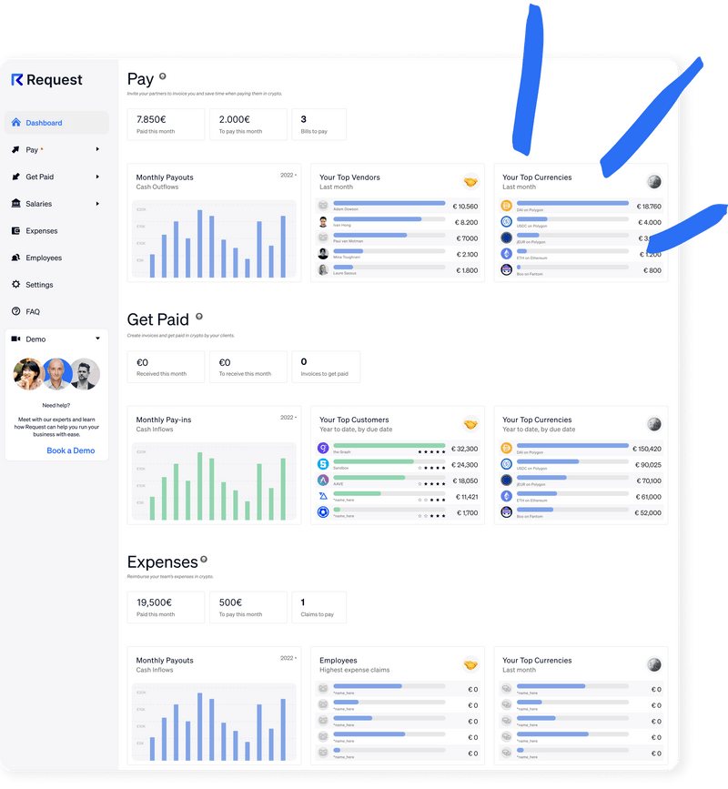Request Finance is one of the largest crypto payroll platforms, which has enabled over 2,000 Web3 teams to pay more than $300 million in crypto payroll, expenses and invoices. It allows users to pay and get paid in crypto, process salaries and bonuses in crypto, and reimburse expenses in crypto.