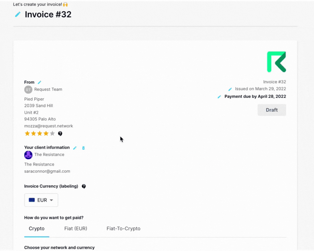 *What is the invoice currency? This is the currency that your invoice will be issued in and can be different from the payment currency which you’ll receive as funds. For example, you can have the invoice currency as EUR (fiat) while receiving funds in BUSD as the payment currency. You can also set both the invoice and payment currency as the same currency such as in BUSD.