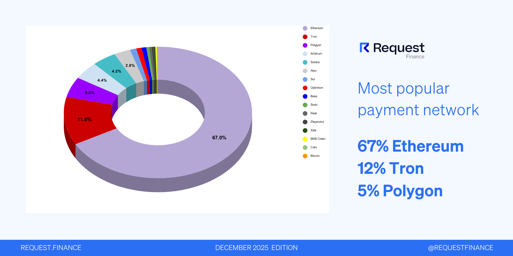 Ethereum remains the most widely used network for crypto payments on Request Finance, accounting for 67% of all transactions.